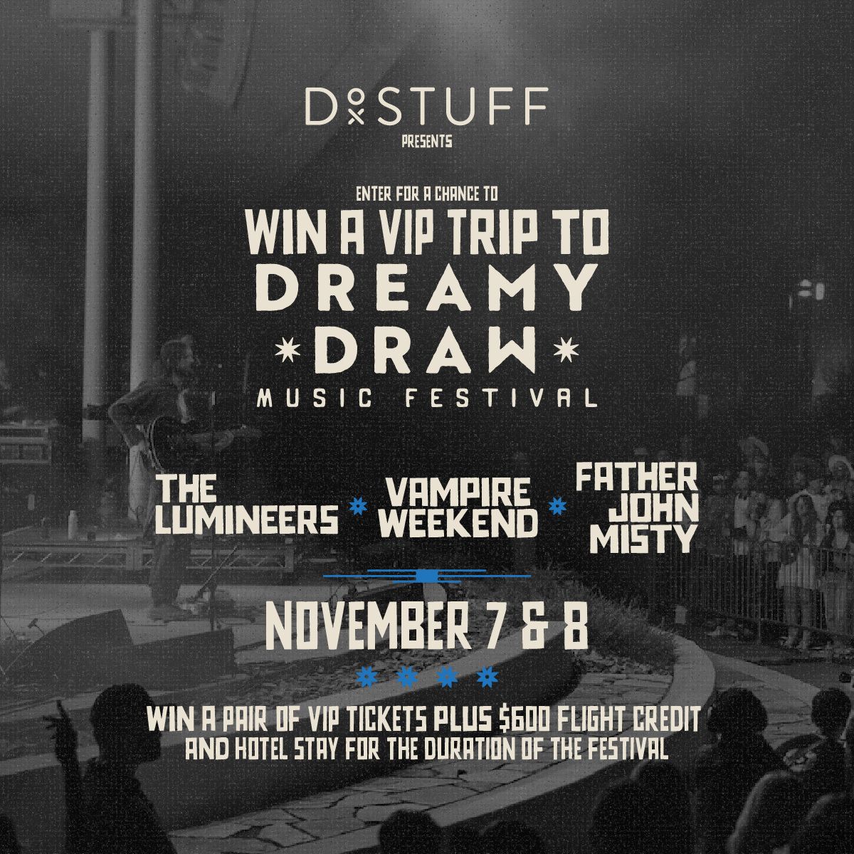 Enter to win a VIP getaway to Dreamy Draw Music Festival, November 7-8 in Scottsdale. See The Lumineers, Vampire Weekend, and Father John Misty live in Old Town. Enjoy VIP passes, a hotel stay, and $600 in flight credit - everything you need for a weekend worth bragging about.*