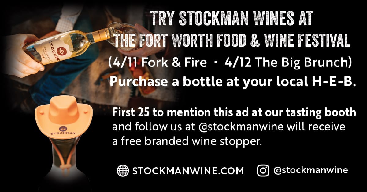 Find Stockman Wines at some of DFW’s best festivals this April. From Fort Worth to Granbury, they’re pouring all month long - including Fork & Fire and The Big Brunch this weekend! The first 25 people who show this ad + follow @StockmanWine score a free wine stopper.*
