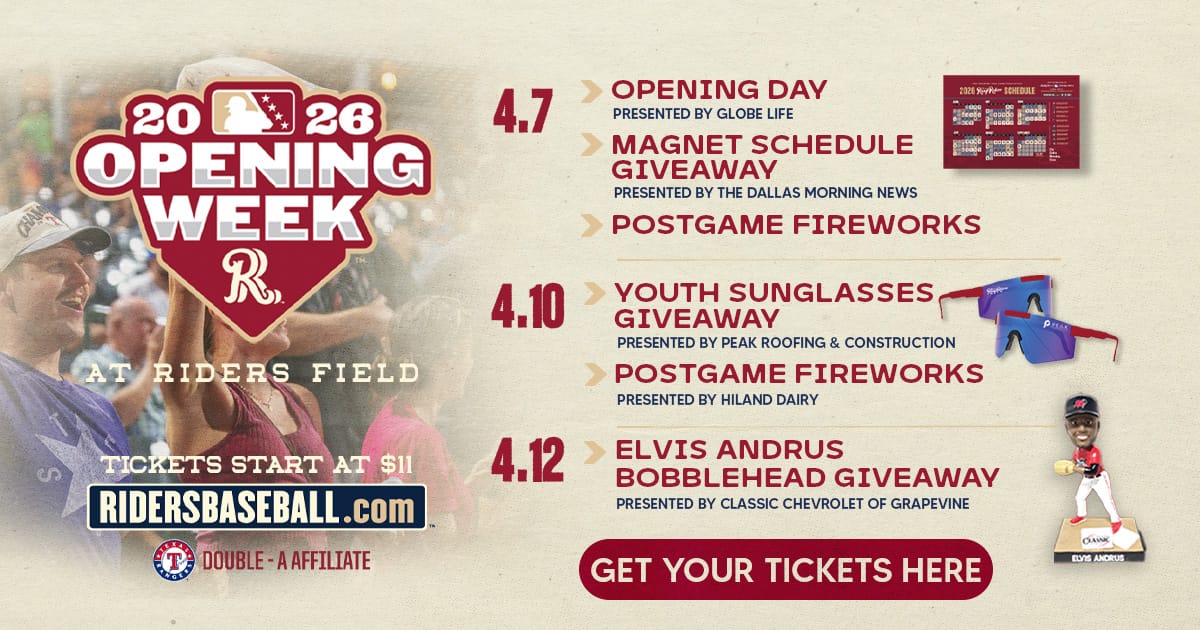 Baseball is back. Kick off opening week at Riders Field as the Frisco RoughRiders face the Midland RockHounds. Grab a hot dog, catch the action, and stick around for postgame fireworks. Want to win a four-pack of tickets for the whole crew? Hit the link to enter for a chance to win.*