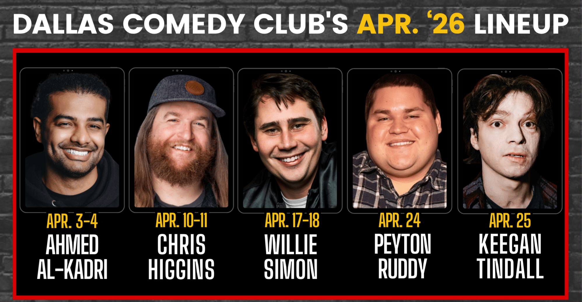 Dallas Comedy Club is stacked this April with comics like Ahmed Al-Kadri, Chris Higgins, Willie Simon, Peyton Ruddy, and Keegan Tindall. From touring acts to rising names, there’s something funny happening all month long.*