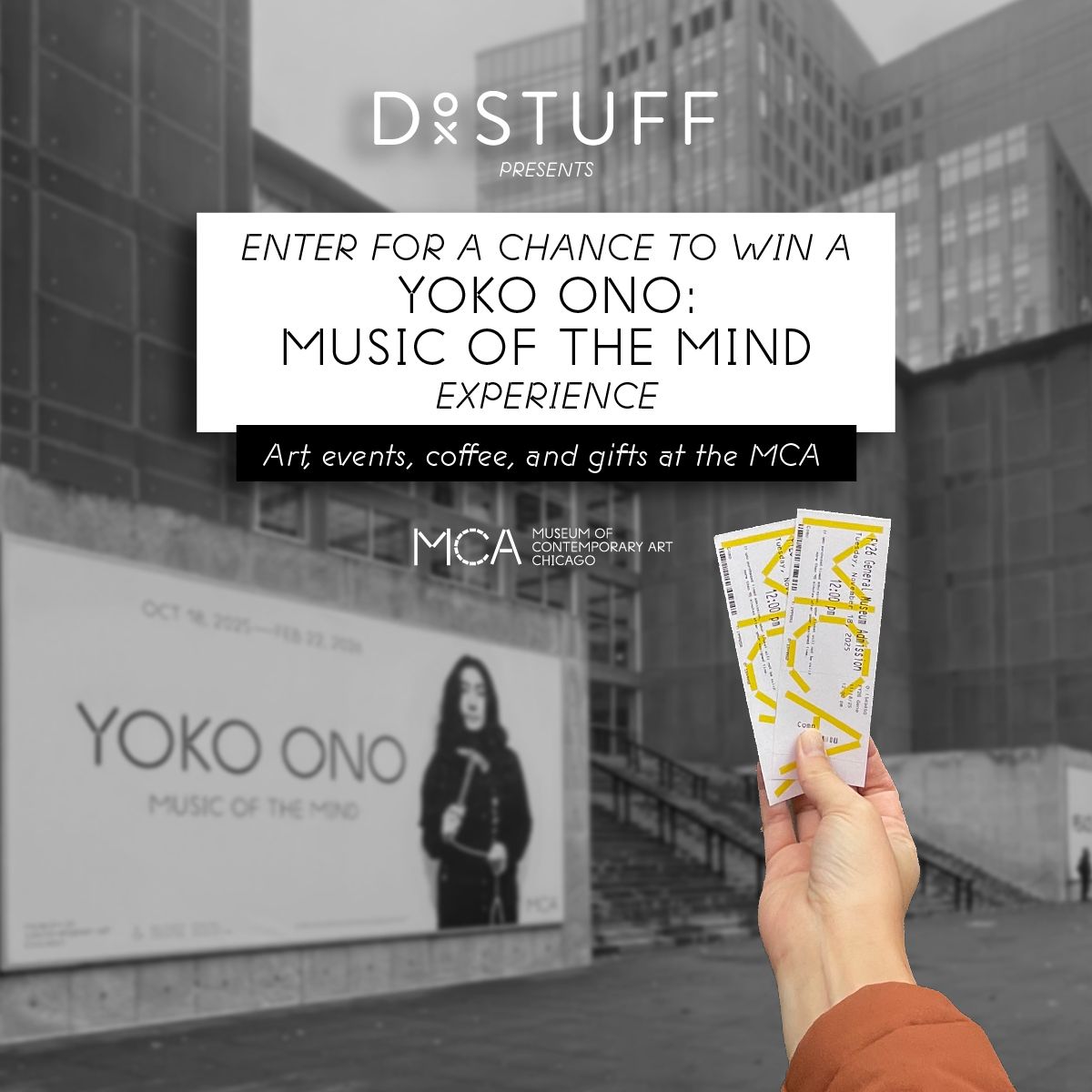 Enter for a chance to attend Yoko Ono: Music of the Mind at the Museum of Contemporary Art Chicago before the exhibition closes on 2/22. One winner receives two MCA admission tickets, two complimentary tickets to select programs including the 2/18 birthday event, two coffees at Marisol, and a gift bag from the MCA Store. The giveaway also includes a one-night stay at Thompson Chicago and a $600 flight credit. Discover a landmark exhibition built around participation, ideas, and creative action.